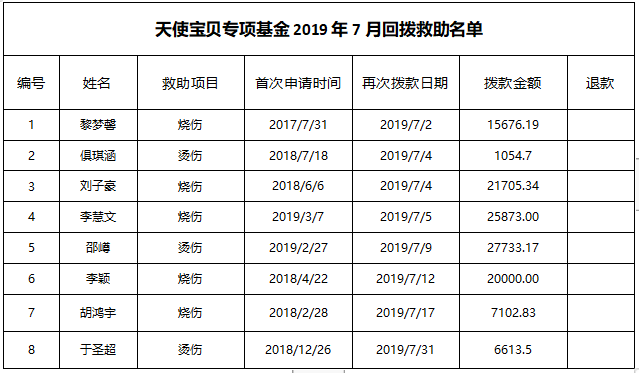 2019年7月天使宝贝共救助意外伤害儿童8名,新增救助儿童7名。总计拨款320000元,退款2603.12元,实际拨款317396.88元。