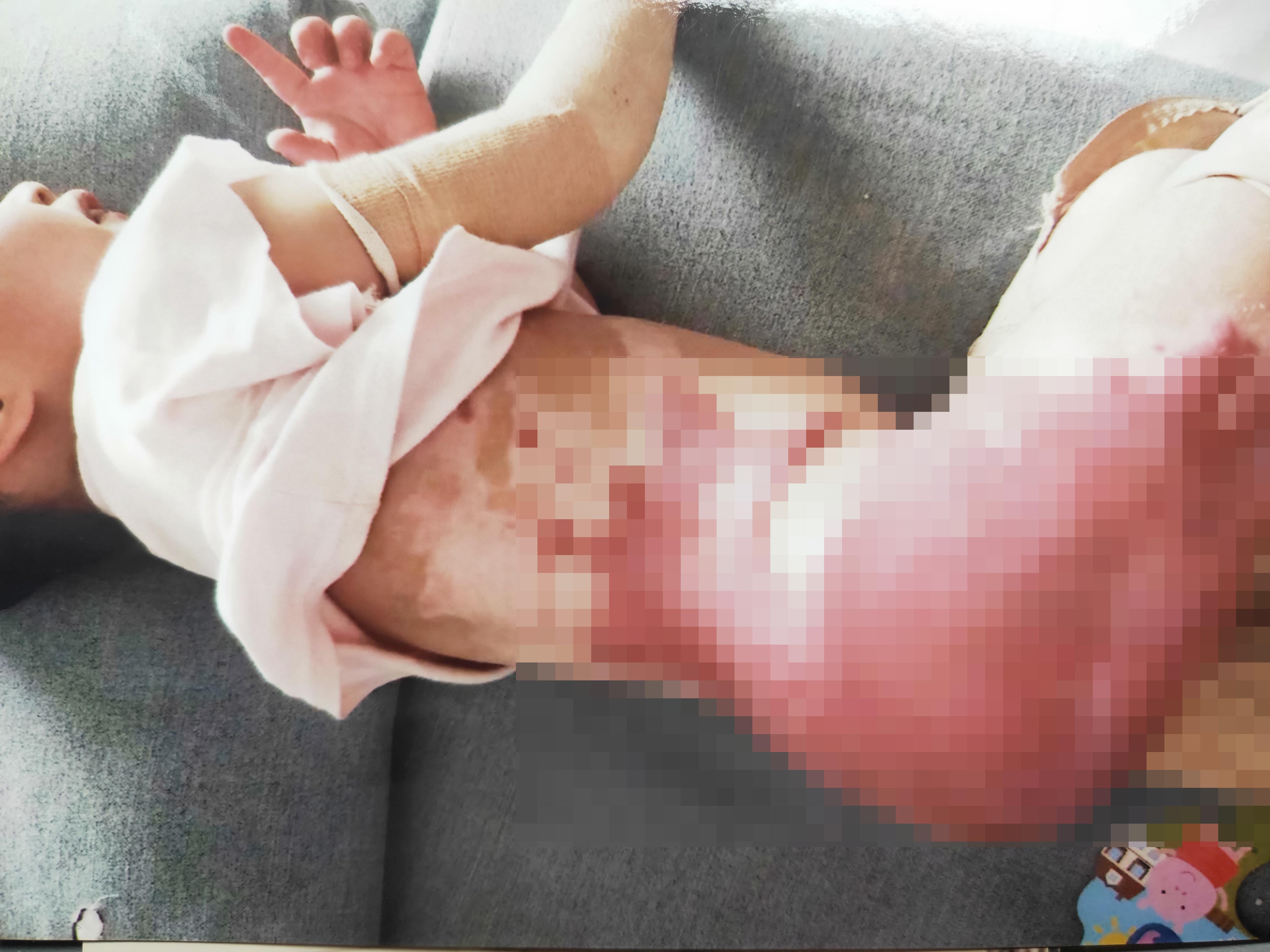 2019年7月2日早上8点半左右,胡行行烧了桶水准备洗头,出去接冷水时,怕女儿从床上摔下来,就把孩子放在地上玩,却忘了放在角落里的水桶,没有意识到危险的存在,可偏偏十个月大的宝宝在爬行中撞翻了水桶,造成下半身被严重烫伤。