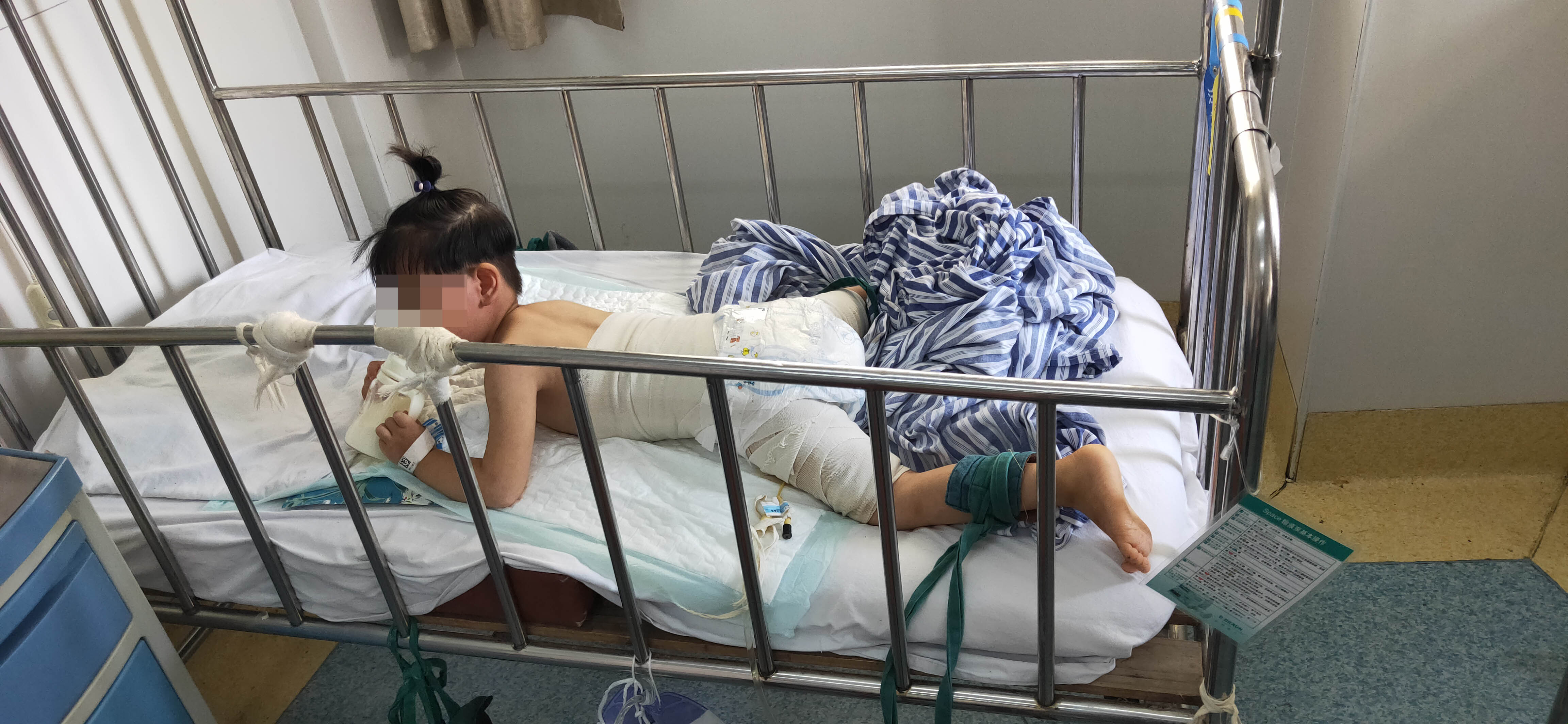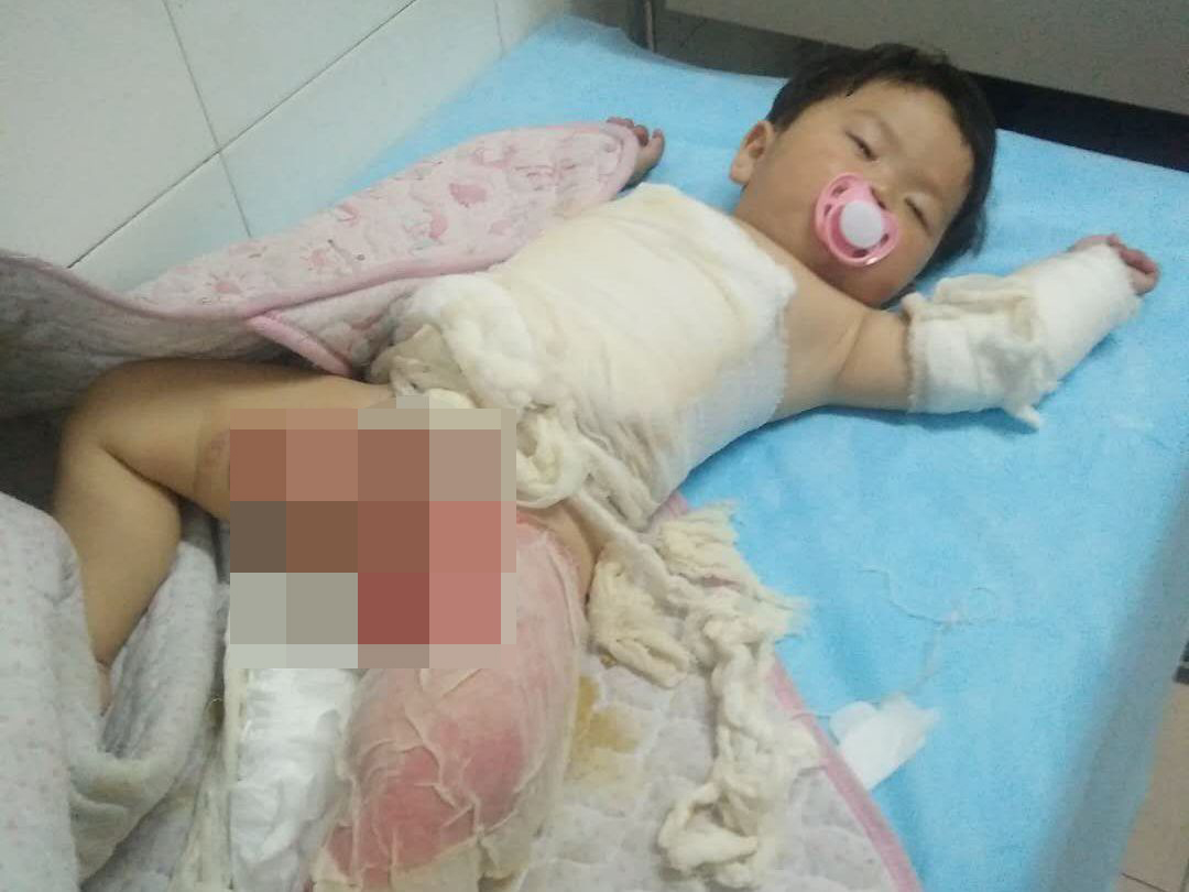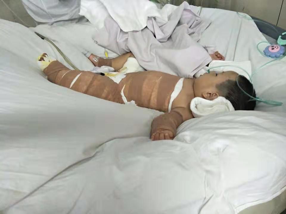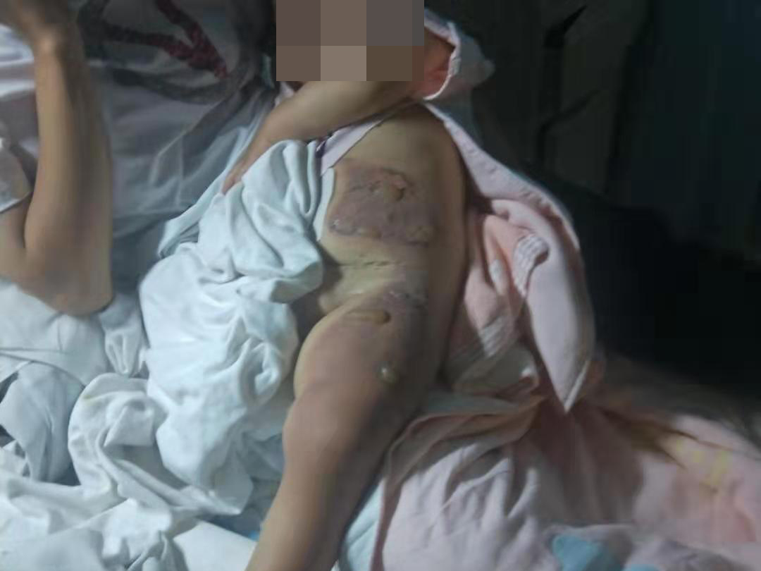 2019年6月1日晚八点,小女儿董思慧在学步车里坐着,把一壶刚烧开的水拉翻倒在了自己身上,慌乱中的付厚蓉立即脱去孩子身上的衣服,被烫伤的皮肉已经脱落,见此状况,她急忙找车把孩子送到当地县医院,医生给孩子做了简单的包扎后,让立马去安康市医院,她一刻不敢耽误,在最短的时间内将孩子送到了安康市高新医院,医生告知,孩子烫伤太严重,随时可能休克,要想保命赶紧去西京医院。