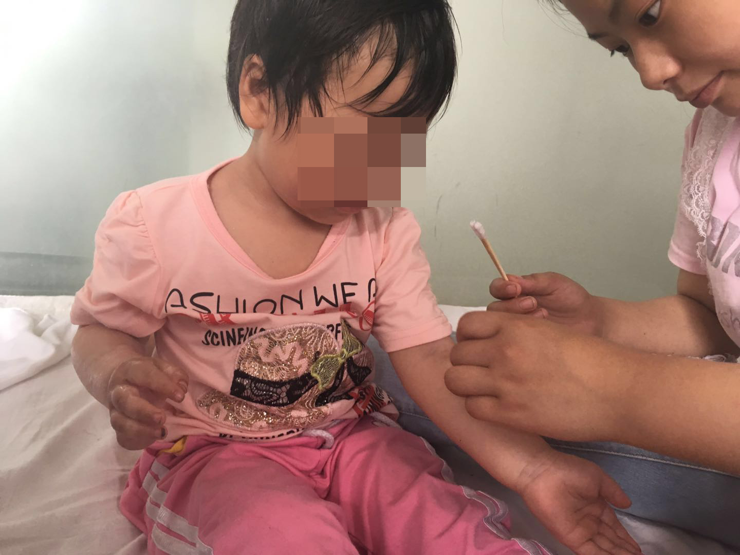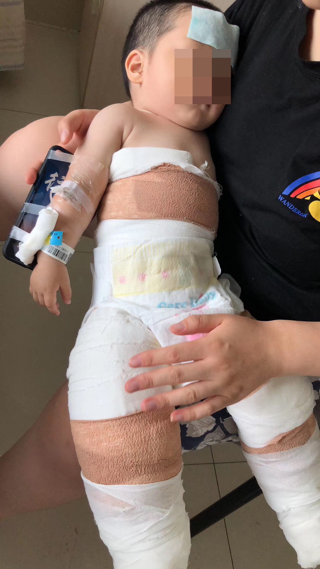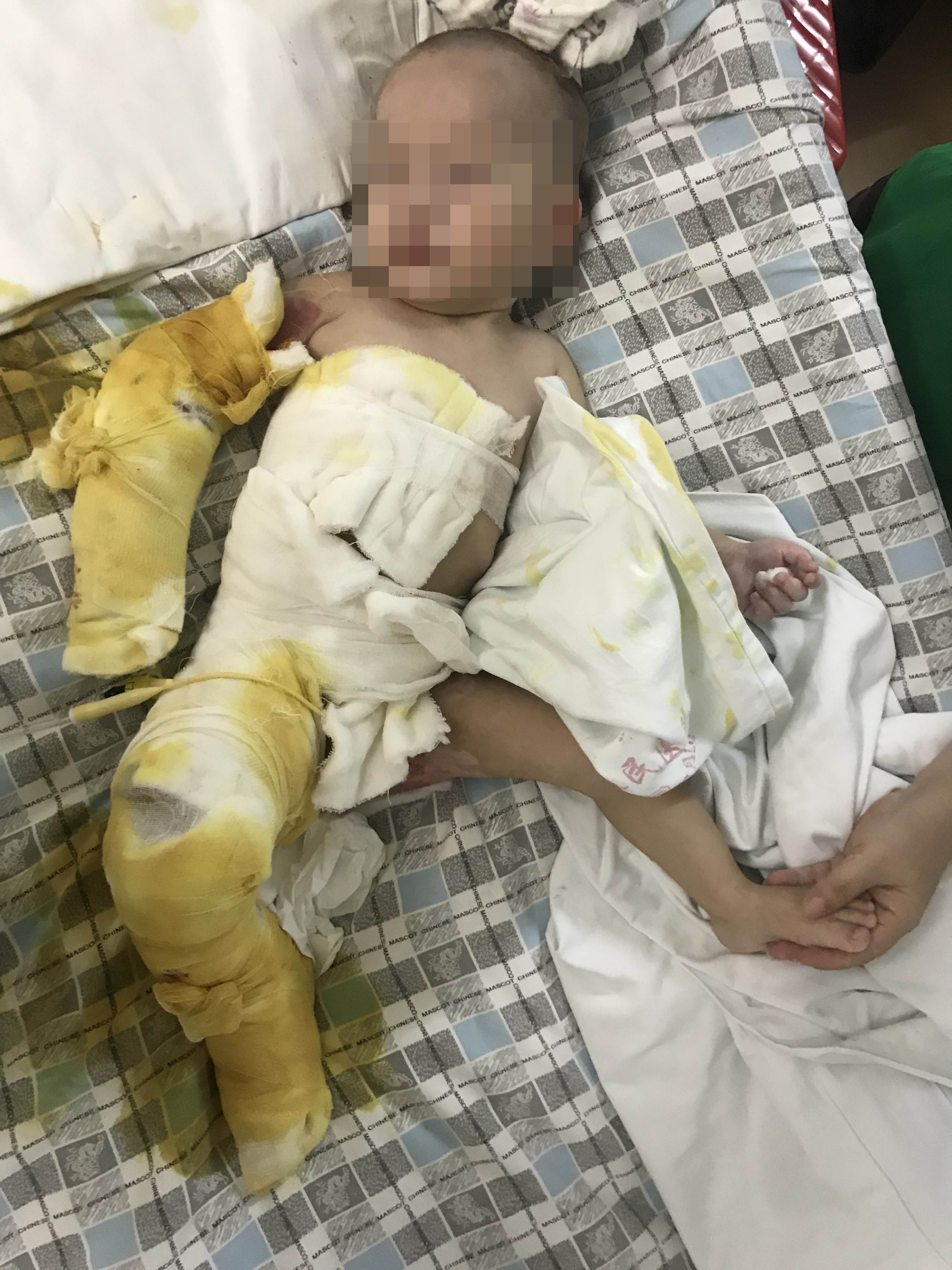 2019年6月1日晚八点,小女儿董思慧在学步车里坐着,把一壶刚烧开的水拉翻倒在了自己身上,慌乱中的付厚蓉立即脱去孩子身上的衣服,被烫伤的皮肉已经脱落,见此状况,她急忙找车把孩子送到当地县医院,医生给孩子做了简单的包扎后,让立马去安康市医院,她一刻不敢耽误,在最短的时间内将孩子送到了安康市高新医院,医生告知,孩子烫伤太严重,随时可能休克,要想保命赶紧去西京医院。