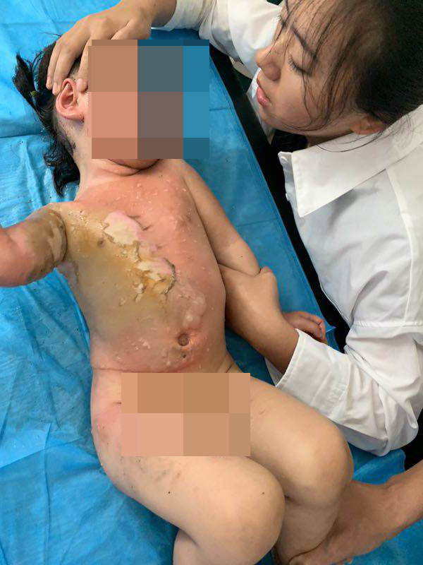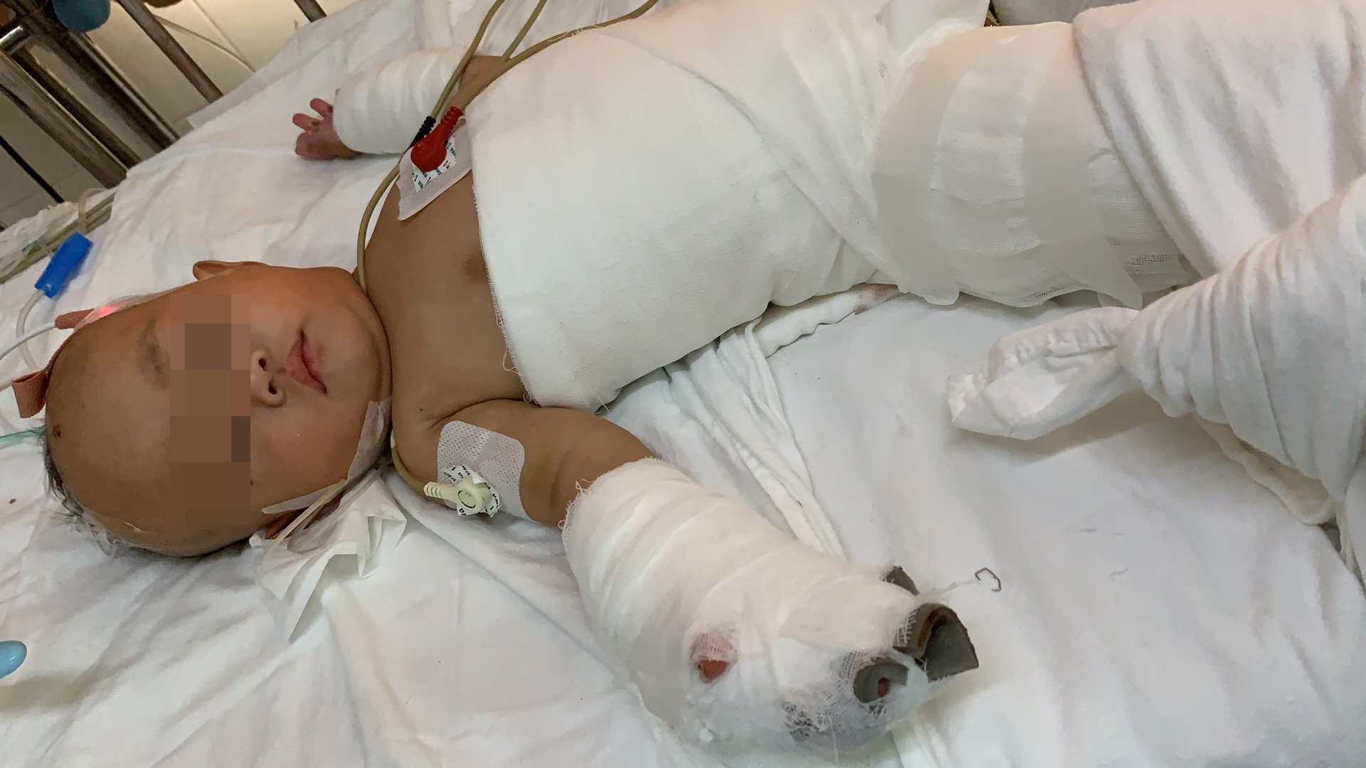 到了重庆西南医院后,医生立刻将孩子送到了重症监护室,诊断为:火焰烧伤18%(浅 II°6%;深II°6%;III°6%)面颈部、前驱干、双上肢及右下肢。胸部以下皮肤全层烧伤。