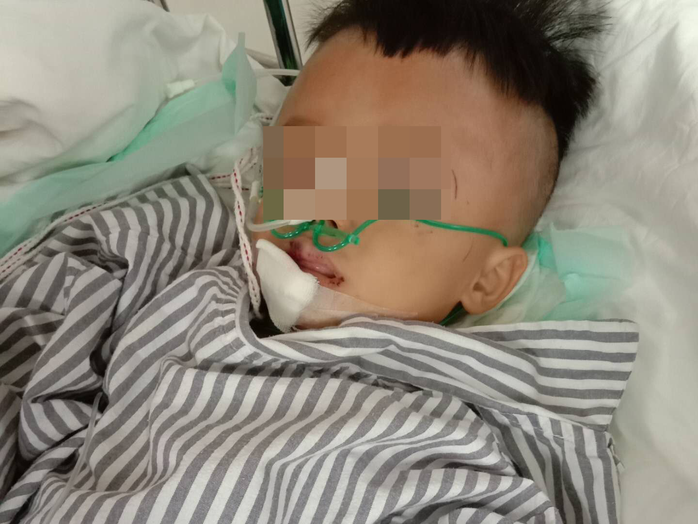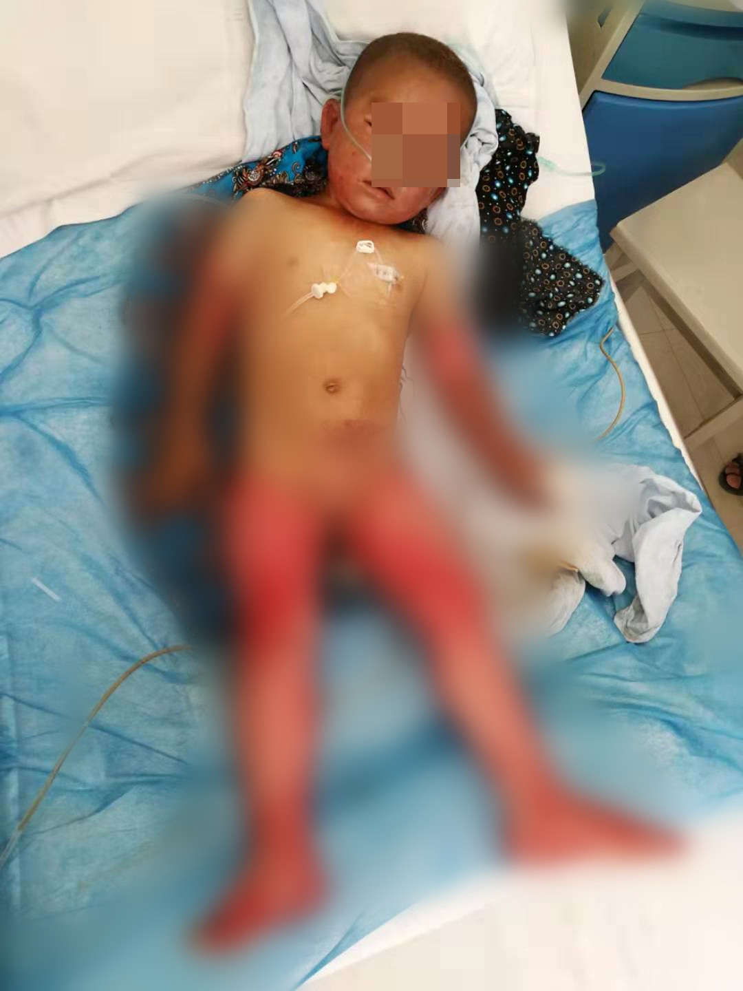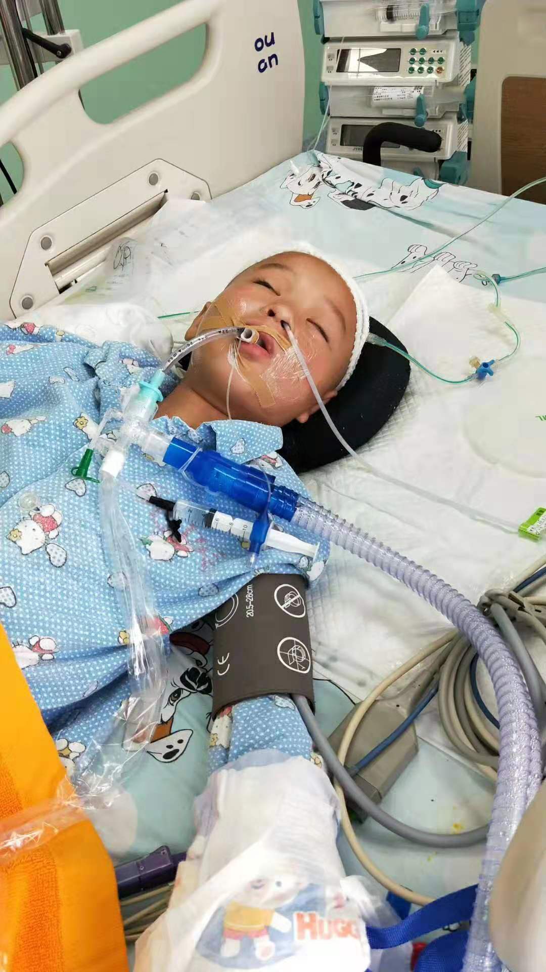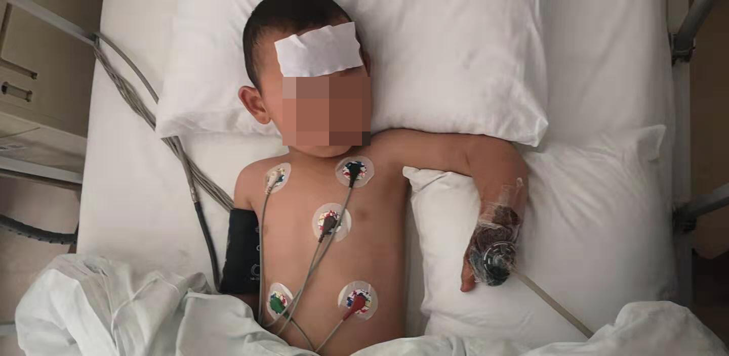 2019年6月3日下午4点左右,小思毅不小心踩进刚发好的石灰池里,家人听到哭声后急忙跑去抱起孩子,做了简单清洗后送到了鳌头卫生院,孩子情况严重,医生建议转去茂名市人民医院,到了茂名市人民医院孩子直接被推进了烧伤科的监护病房。