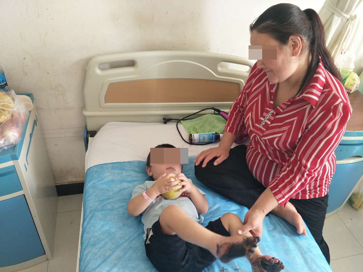 2019年5月29日下午,赵奕程刚刚睡醒,奶奶拿奶瓶准备冲奶粉,刚刚学会走路的孩子抓倒了放在角落的热水壶,开水洒在了孩子的小腿上。