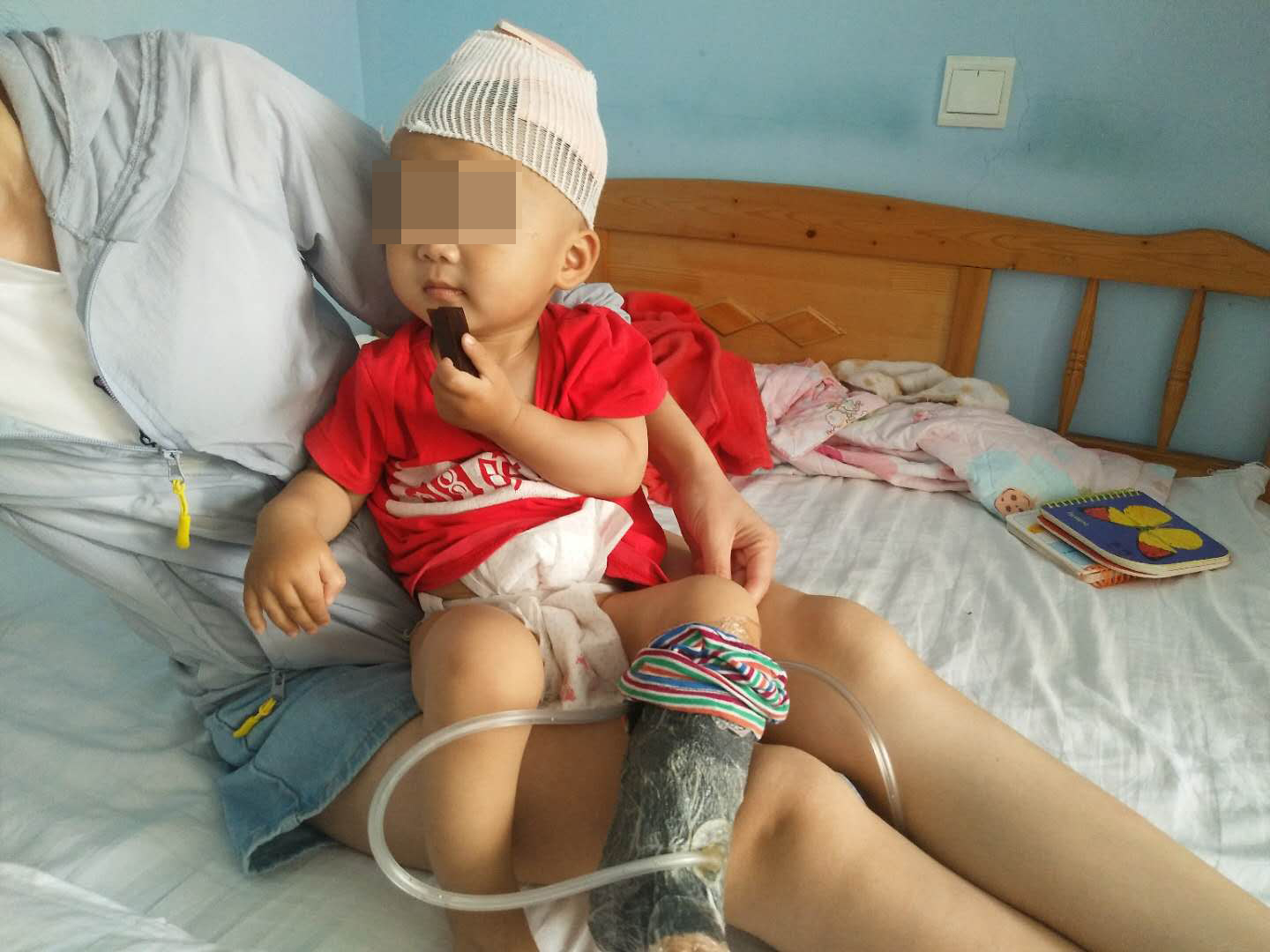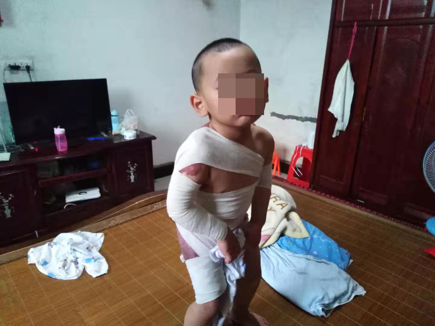 2018年12月10日,奶奶带着两个孙子去亲戚家串门,不料却发生意外,徐翊逍不小心掉进了刚烧开的热水盆里,造成右侧身体严重烫伤。