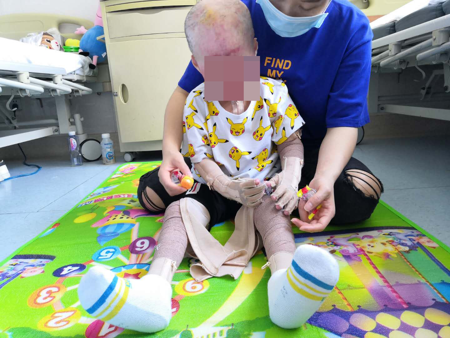 2018年9月24日家里发生了燃气泄漏,爷爷、奶奶、和她最爱的儿子皓阳都被大火烧伤,10月6日爷爷和奶奶一起走了,让郑欣欣痛上加痛,已经快到了崩溃的边缘,只是皓阳还没有脱离危险,她必须坚持之下,9月29日、10月10日,17日、25日、30日、11月15日皓阳进行了6次清创+植皮手术和1次左手尾指中远节截除术,每次母子在手术前对话的时候,虽然皓阳的声音非常小,但妈妈知道皓阳非常的坚强,他一定会坚持住的,幸运的是孩子手术都很成功,创面植皮成活良好,11月23日,创面愈合的皓阳和妈妈一起来到了广东省工伤康复医院治疗。康复期间孩子身上慢慢出现了瘢痕增生,挛缩畸形,他的手掌无法伸直,俗称爪形手,握力、提力都非常的差,多处四肢关节受限,双手、双腕、双踝畸形,3月29日皓阳又在红十字会医院进行了左手掌、手指瘢痕切除松解手术、左手掌关节复位术、植皮术等治疗,目前已经回到康复医院2个月的皓阳,虽然身上还有很多地方需要继续手术,但他的精神和心理状态已经有了很大的提高,妈妈欣慰的看到孩子长大了。