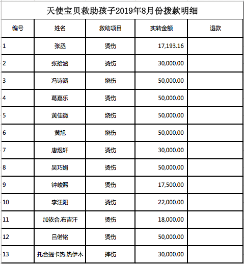 2019年8月天使宝贝专项基金共救助意外伤害儿童18名,新增救助儿童13名。总计拨款553894.16元,退款117358.5元,实际拨款436535.66元。