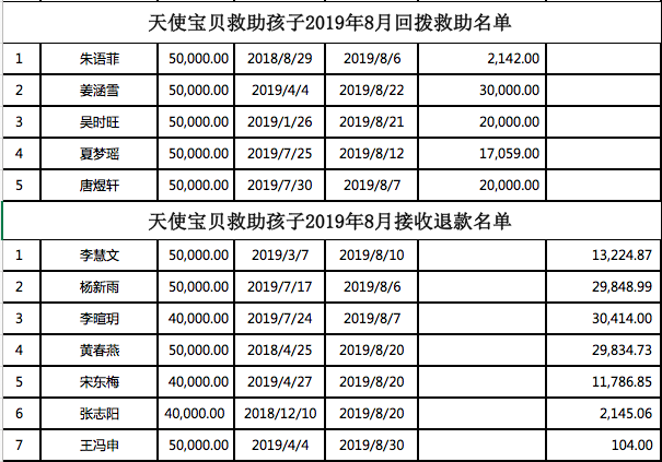 天使宝贝基金会自2018年8月20日成立以来,截止2019年8月31日共救助30名受伤儿童,拨款金额总计:1298498.64元。