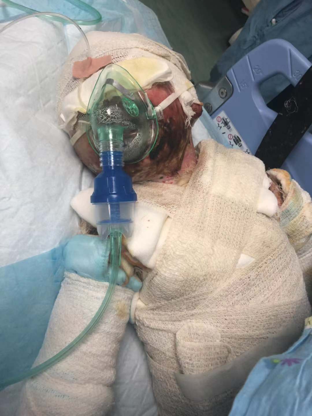 孩子被诊断为:全身多处火焰烧伤面积达85%BSA,特重烧伤,吸入性损伤;烧伤休克。 因病情危重,肺部感染和排异反应,导致高烧反复,8月2日转儿科ICU治疗,予以呼吸机辅助呼吸、创面换药、促进上皮生长、抗感染、脏器功能保护、营养支持、维持水电解质平衡等处理,平均每周一次清创手术。8月23日从重症监护室转入普通病房,脸部创面已经愈合,身上还比较严重。