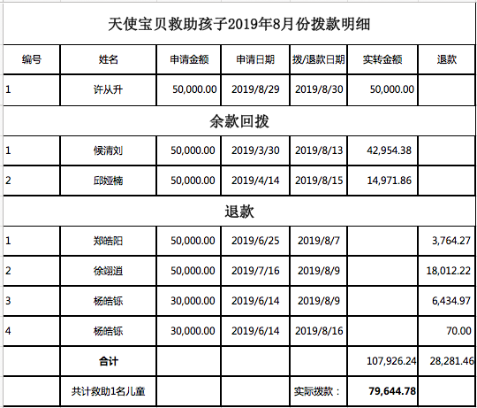 2019年8月天使宝贝共救助意外伤害儿童3名,新增救助儿童1名。总计拨款107926.24元,退款28281.46元,实际拨款79644.78元。
