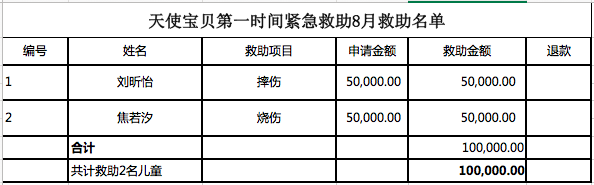 2019年8月第一时间紧急救助项目新增救助儿童2名。拨款总计:100000元。