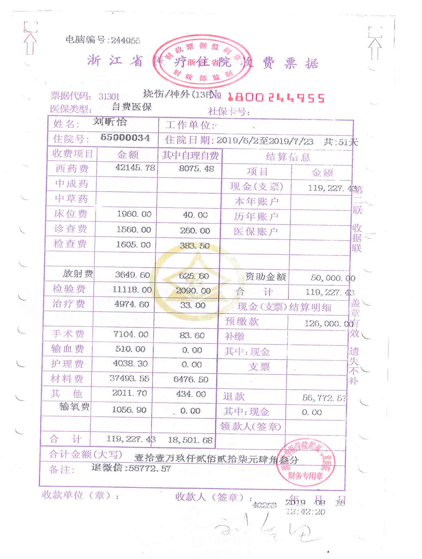 小女儿黄佳薇最严重,现在已经动了两次手术,医生诊断,多处烧伤至少有一处三度烧伤,身体体表70一79%烧伤,肩和上肢三度烧伤,腕和手三度烧伤,躯干三度烧伤,髋和下肢三度烧伤,踝和足三度烧伤头和颈二度烧伤,面部二度烧伤,躯干二度烧伤,煤气火焰烧伤全身多处78%深红18%Ill60%,呼吸道烧伤医生说后续的治疗费用很高很高,我们压根无力承担!