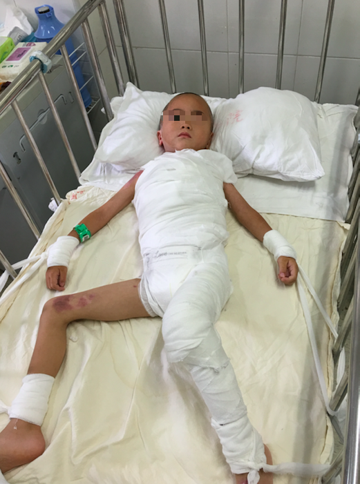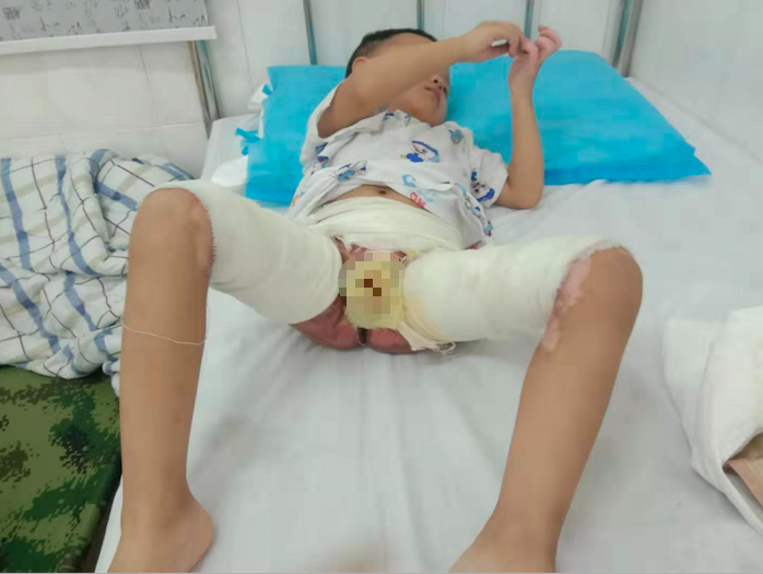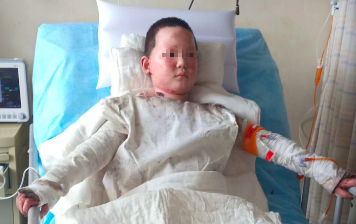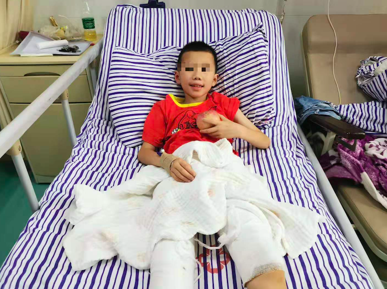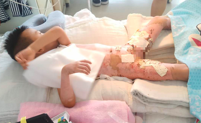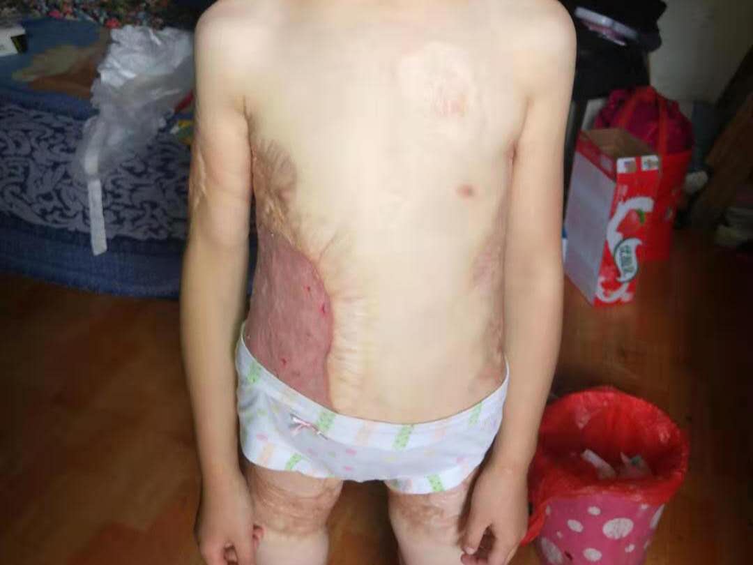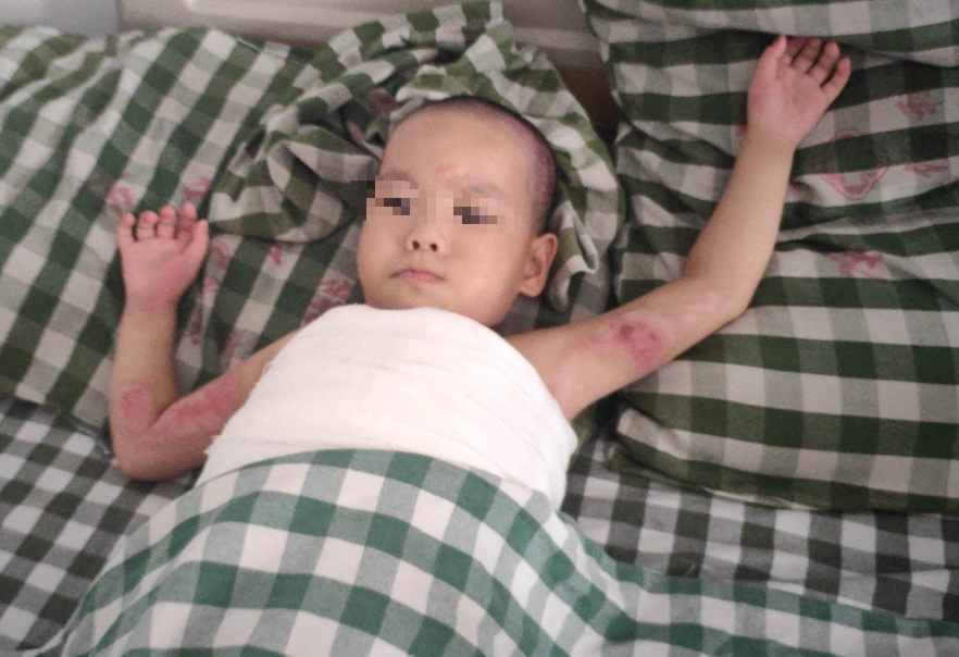 造成全身20%的面积严重烫伤,目前在湖南中医药大学第一附属医院烧伤科治疗。炎炎夏日,一家人看着孩子包裹着厚厚纱布,内心很自责很痛苦,也为孩子的后期治疗费用忧心忡忡。