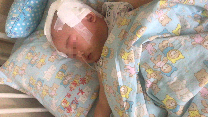 们打了120,在桐乡妇幼保健院医护人员帮助下送到桐乡人民医院,在那边做了检查,拍了CT,医生说颅内出血,随时有生命危险,要紧急转院到省儿童医院,这一路上小宝宝也坚强 。一路平安的到达了医院,晚上急诊在那边做了检查了,紧急情况下医生给小宝做了开颅手术手术,手术很成功。术后小宝住进了ICU 。