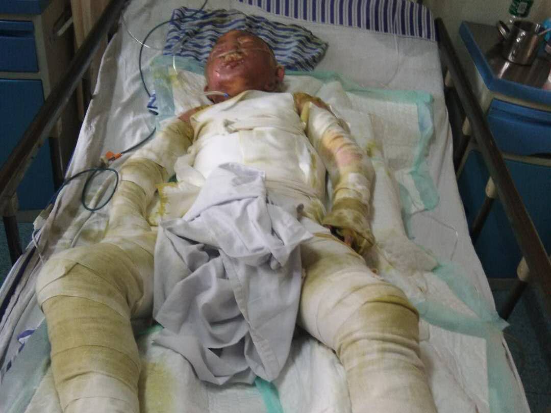 今年7月10日,张丞和11岁的哥哥一起在做面条的时候,不小心绊倒电线,把电子炉里面开水打翻,开水直接倾倒在4岁的小儿子张丞身上,主要创伤在手、腹部、命根子到两边大腿处,烫伤面积达25%~~30%,之前在岳阳市第一医院肾内烧伤整形科治疗了十天,伤情还没有好转。