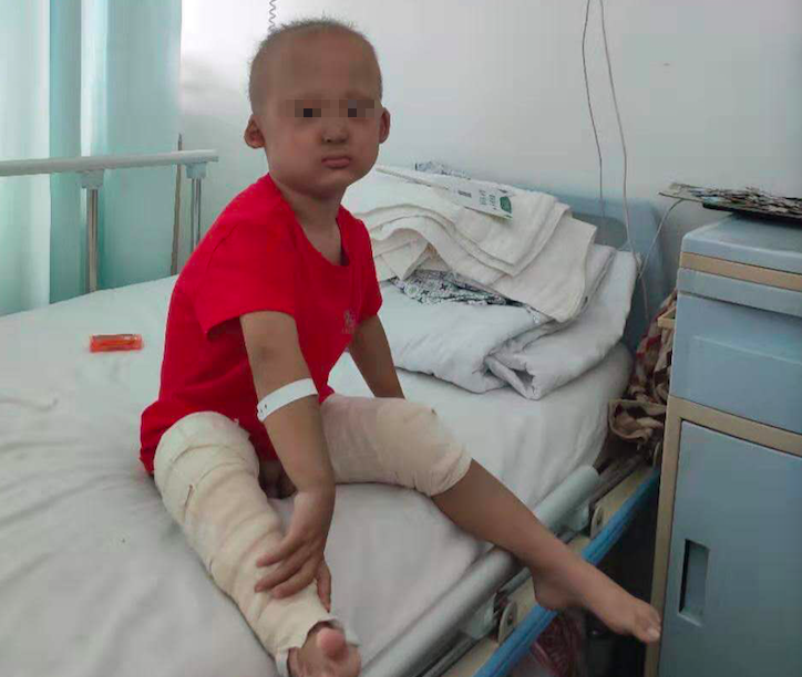 2019年7月15日,三岁半的孙子唐煜轩趁大人没注意独自跑进厨房,不慎被地上的电线绊倒,抓翻了一锅滚烫的蒸馒头的热水,热水正好全部浇在孩子的右腿上,在疼痛下孩子几度出现休克症状。