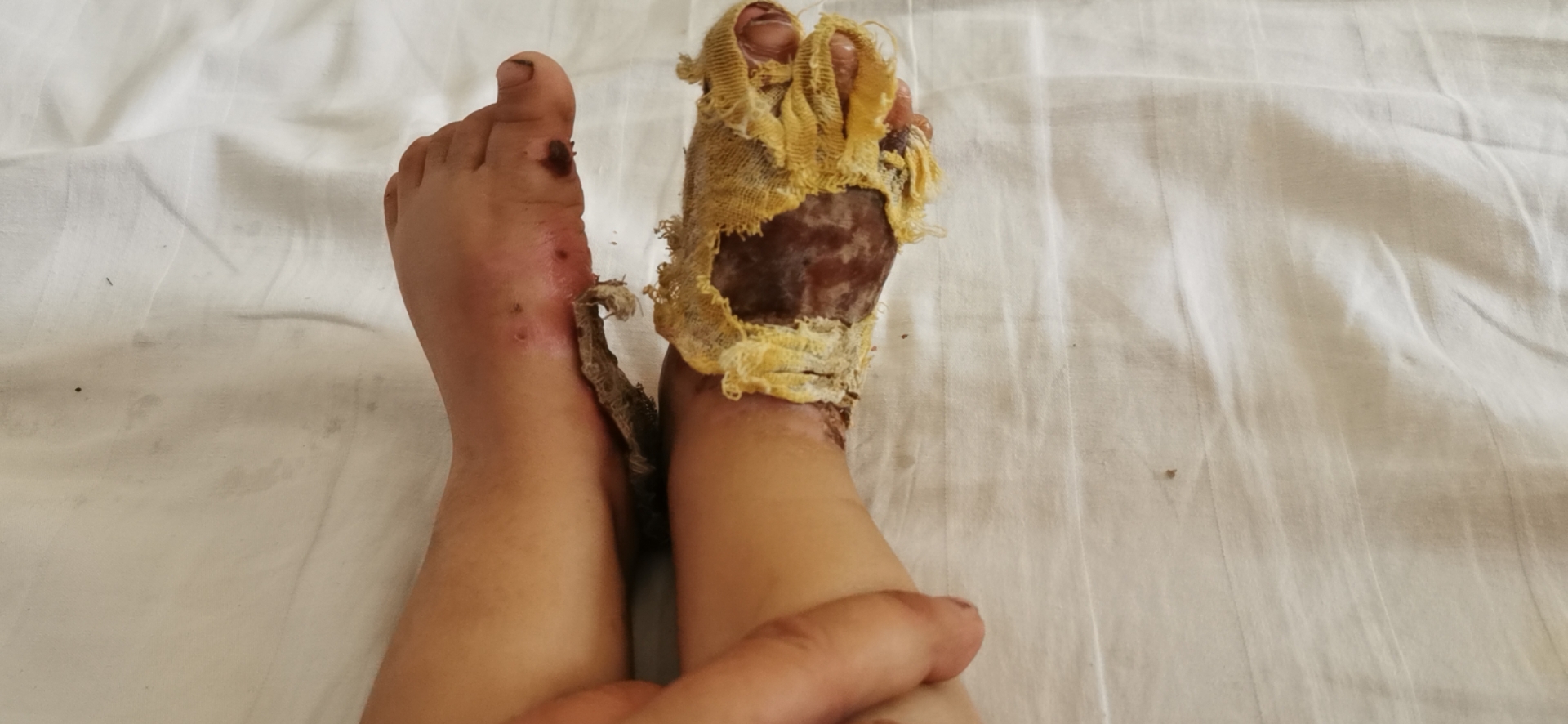 妈妈急忙带着孩子赶到了伊犁解放军946医院,加依合被诊断为:创面位于双足,烫伤面积5%;呈Ⅲ度创面,创面表皮已经撕脱,基底呈苍白色,质地较硬,温度较低,痛觉迟钝,在包扎完创面后,医生建议孩子住院治疗,可是妈妈却没有钱来治疗,只能带着孩子回到了家里。