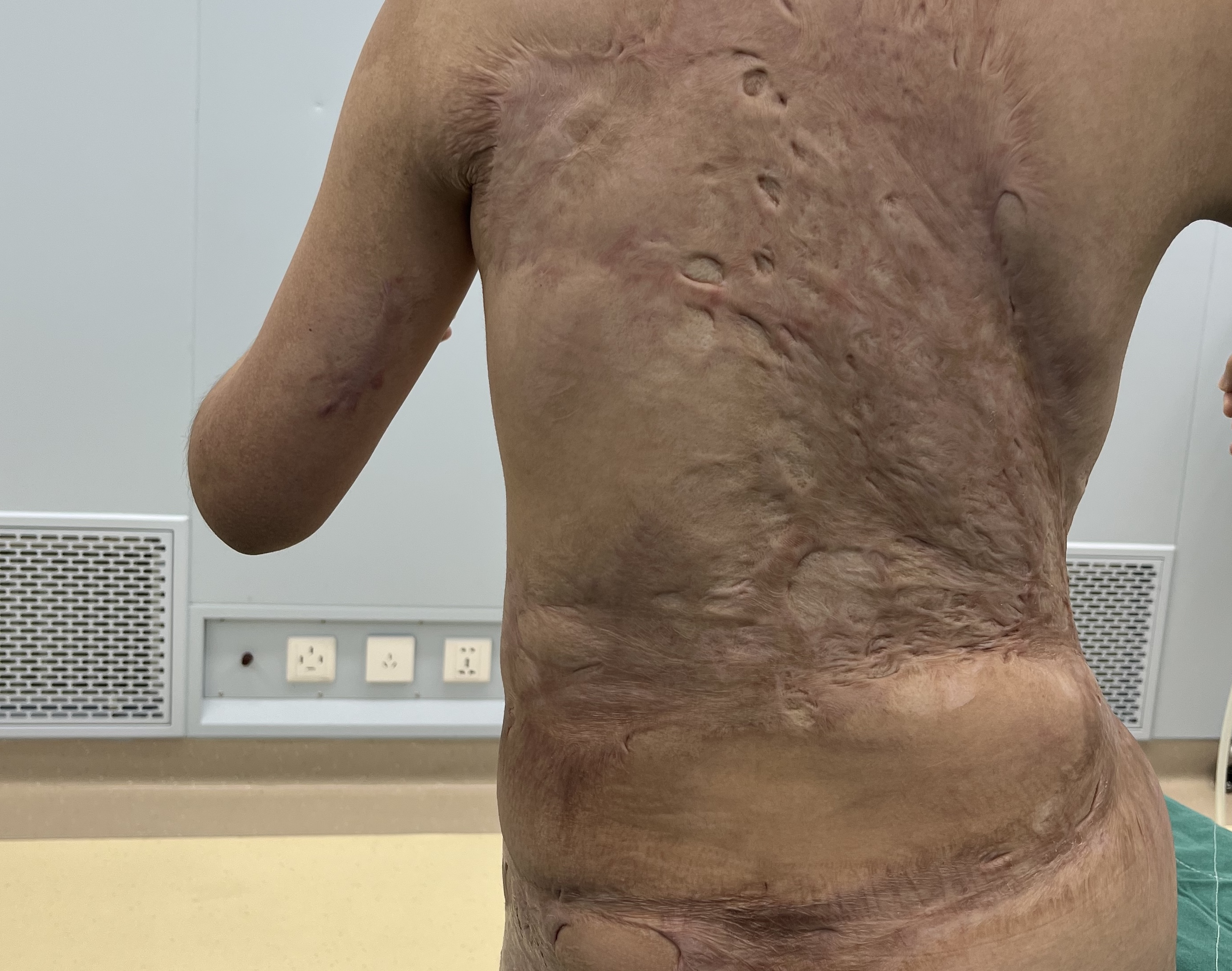 此后的十年间,右腰腹部的严重瘢痕挛缩像一道无形的枷锁,不仅束缚着小卉的身体,更在暗中扭曲着她的成长——瘢痕拉扯导致她脊柱侧弯高达38度,身体逐渐畸形,生活和学习都面临巨大困难。