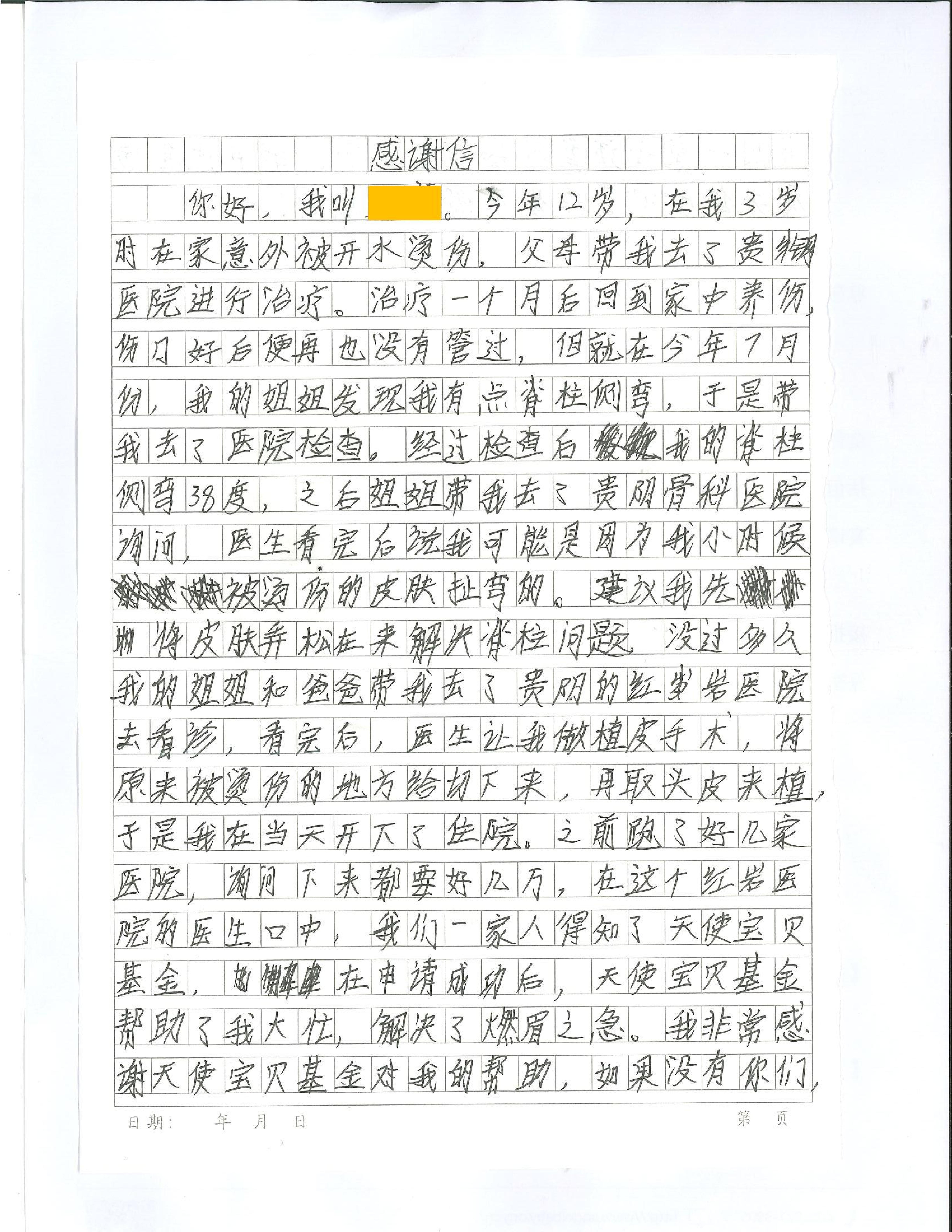 出院前,这个善良的女孩在作文纸上工工整整地写下了一封对基金会的感谢信,一字一句,真挚动人。